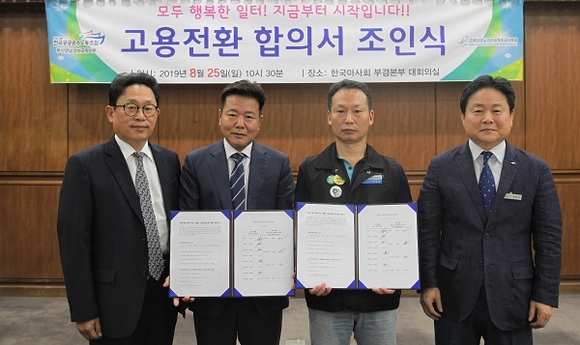 한국마사회 부산경남지역본부는 이날 오전 10시 대회의실에서 오문식 조교사협회장과 양정찬 공운노지부장 등 양측 교섭위원과 김종국 경마본부장(상임이사), 정형석 부산경남지역본부장 등 마사회 관계자가 참석한 가운데 '말관리사 협회 고용전환' 조인식을 가졌다고 26일 밝혔다.