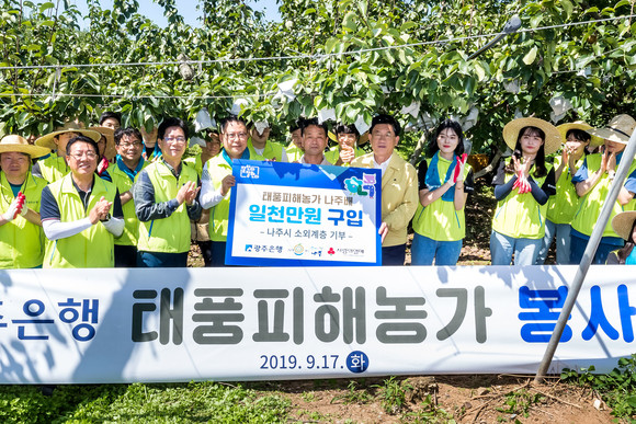 광주은행(은행장 송종욱)은 제13호 태풍 링링의 영향으로 피해를 본 농가의 피해복구 지원을 위해 17일 오전 10시 나주 금천면 배 농가에서 일손돕기 봉사활동을 진행했다고 밝혔다.