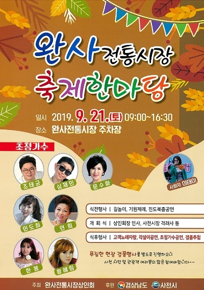 경남 사천시는 오는 21일부터 10월 4일까지 진행되는 전통시장 가을축제 기간을 맞아 21일 오전 10시부터 곤명면 완사리 소재 완사시장을 시작으로 삼천포중앙시장, 사천읍시장에서 '전통시장 가을축제'가 열린다고 16일 밝혔다.