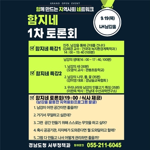 경남도는 19일 오후 7시 한국토지주택공사(LH) 남강홀에서 진주 남강을 주제로 지역주민과 공공기관과의 지역융화프로그램 발굴을 위한 '함지네'(함께 만드는 지역사회 네트워크) 전체 토론회를 개최한다고 밝혔다.