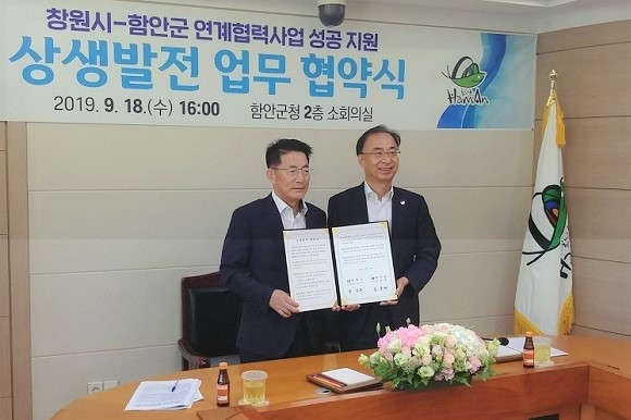 경남 창원시와 함안군은 18일 함안군청에서 시군 간의 연계협력 강화를 위한 상생발전 업무협약식을 가졌다.