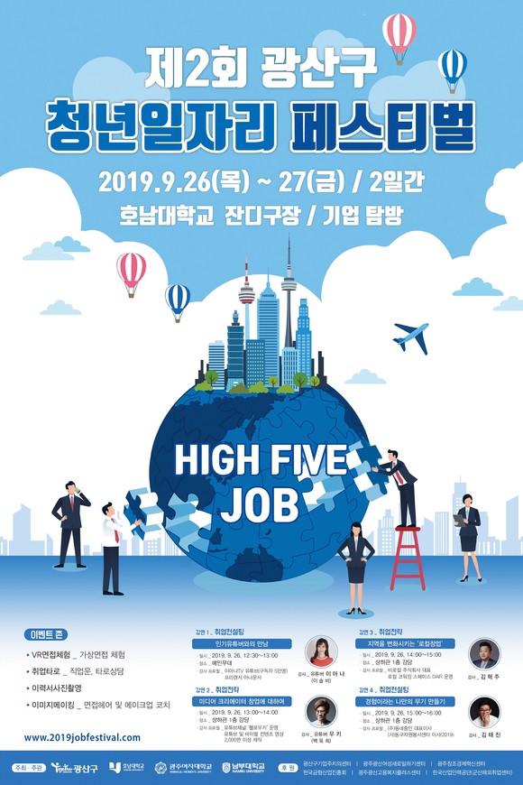 광주 광산구(구청장 김삼호)가 26~27일 광주여대, 남부대, 호남대와 호남대 잔디운동장에서 ‘HIGH FIVE JOB(하이 파이브 잡)’을 구호로 ‘제2회 청년 일자리 페스티벌’을 개최한다.
