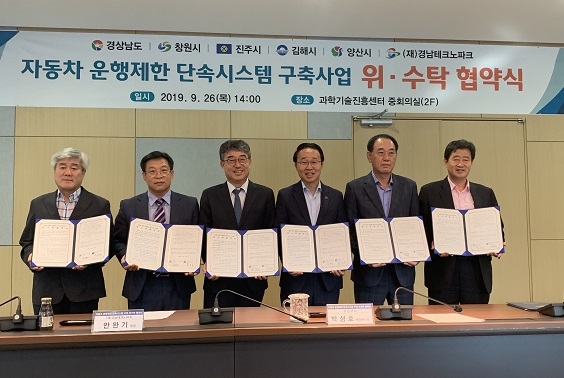 경남도와 4개시(창원·진주·김해·양산)가 경남테크노파크와 26일 과학기술진흥센터 중회의실에서 '자동차 운행제한 단속시스템 구축 위·수탁 협약'을 체결했다.