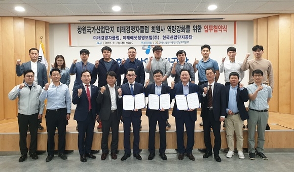 한국산업단지공단 경남지역본부는 26일 공단 6층 대회의실에서 창원국가산업단지 미래경영자클럽(이하 미경클), 미래에셋생명보험과 회원사 역량강화를 위한 업무협약을 체결했다.
