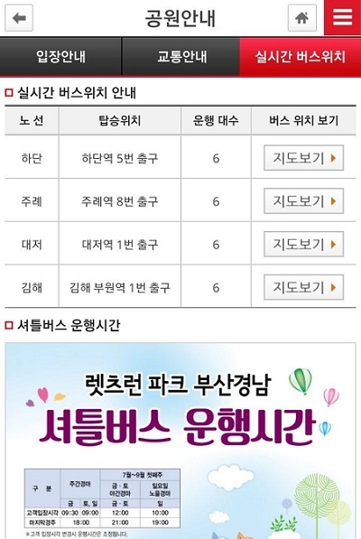 이번 위치 알림 서비스 도입으로 이용자는 셔틀버스가 현재 어디에 위치했는지, 언제 도착하는지 등의 정보를 스마트폰으로 확인할 수 있다. 마사회 모바일 홈페이지에서 렛츠런파크 부경의 '실시간 셔틀버스 위치 안내' 메뉴에 접속하면 노선정보, 노선별 셔틀버스 차량의 현재위치 등을 실시간으로 볼 수 있다.