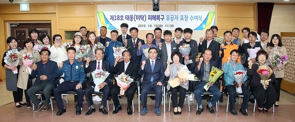 이에 시는 태풍피해로 부터 시민 안전을 지키고 응급 복구활동에 적극 참여하고 지원한 기관 및 단체, 유공시민, 공무원 35명에게 표창을 수여하고 격려했다