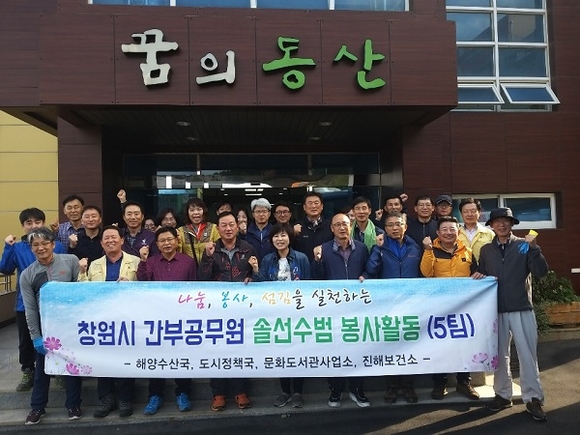창원시 해양수산국과 도시정책국, 문화도서관사업소, 진해보건소 간부공무원 20여명은 15일 마산합포구 구산면 소재 '꿈의동산'을 방문해 자원봉사 활동을 펼쳤다.