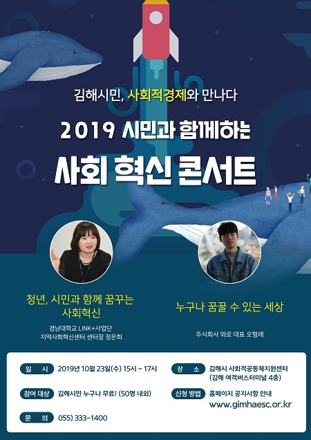 경남 김해시는 오는 23일 오후 3시 김해시사회적공동체지원센터에서 '2019 시민과 함께하는 사회혁신 콘서트'를 개최한다고 16일 밝혔다.