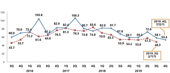 창원상공회의소는 15일 창원지역 제조업체 116개 표본업체를 대상으로 '2019년 4분기 창원지역 제조업 기업경기전망(BSI) 조사'를 실시한 결과, 기업경기전망지수가 '53.4'로 2012년 이래 최저치를 기록했다.