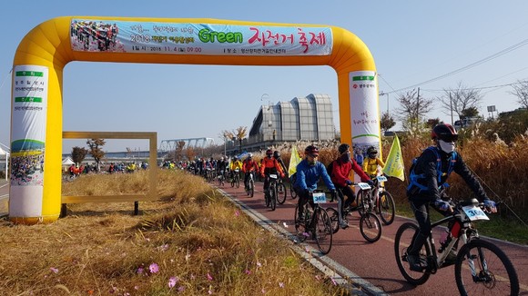 ‘그린자전거 축제’는 영산강자전거길안내센터를 출발해 승촌보-나주대교-빛가람대교-영산대교에 이르는 왕복 45㎞ 사랑코스와 안내센터에서 서창교를 거쳐 승촌보를 반환점으로 하는 왕복 25㎞인 행복코스로 이뤄진 비경쟁 방식 자전거 경주다.