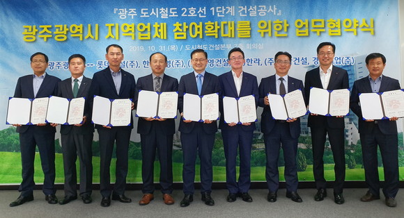 광주광역시는 31일 오후 4시 도시철도건설본부 7층 회의실에서 롯데건설㈜ 등 광주 도시철도2호선 1단계 건설공사 시공사 6개 업체와 ‘광주시 지역업체 참여 확대를 위한 양해각서’(MOU)를 체결했다.