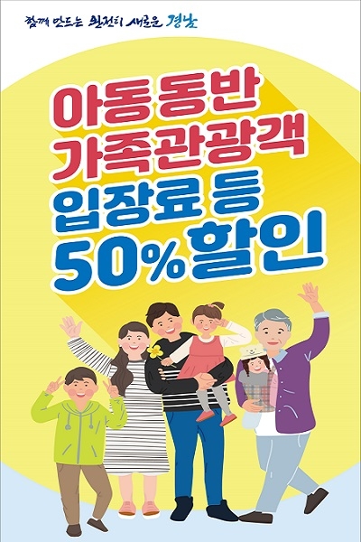 경남도가 아동과 함께 하는 가족 문화를 조성하기 위해 오는 7일부터 아동을 동반한 가족단위 관람객이 도내 공공시설 4개소 입장 시 입장료, 관람료 등을 50% 할인한다고 5일 밝혔다.
