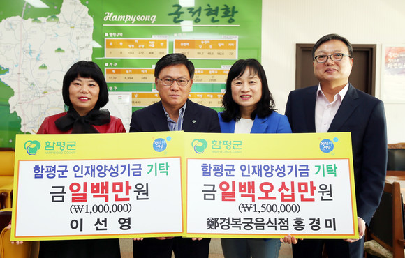 6일 함평군에 따르면 지난달 열린 제26회 남도음식문화큰잔치에서 대상을 수상한 지역 한우․비빔밥 전문업체 鄭경복궁(대표 홍경미)이 지역 인재양성에 써달라며 대회에서 수상한 상금 150만 원 전액을 함평군 인재양성기금에 기탁했다.