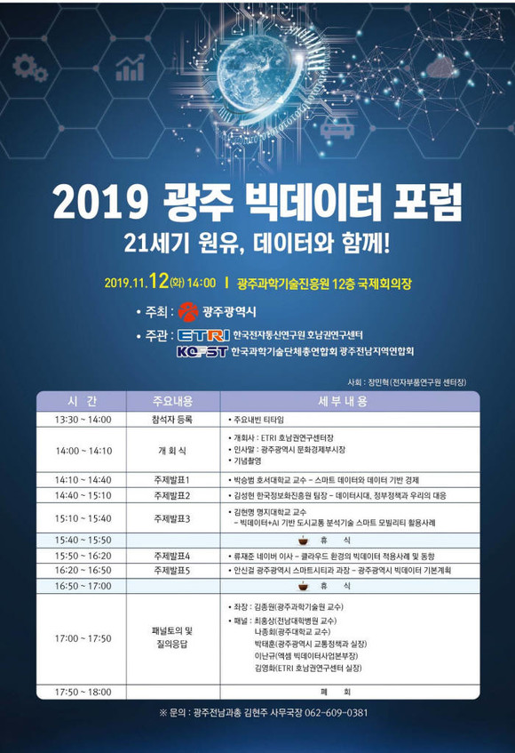 광주광역시는 12일 광주과학기술진흥원 12층 국제회의장에서 ‘21세기의 원유(原油), 데이터와 함께’라는 주제로 ‘2019 광주 빅데이터 포럼’을 개최한다.