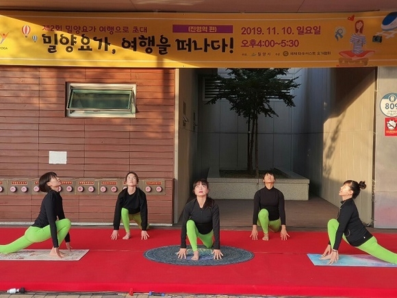 경남 밀양시는 지난 10일 김해 진영역 광장에서 '제2회 밀양요가 여행으로 초대' 무대를 열었다.