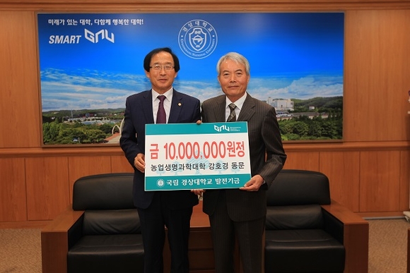 경상대학교는 강호경 전 대우약품공업(주) 대표이사가 대학발전기금 1000만 원을 출연했다고 밝혔다. 강호경 전 대표이사는 경상대학교 농업생명과학대학 환경생명화학과(옛 농화학과) 동문이다.