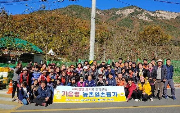 이번 일손돕기는 지난 9월 19일 김해시 내외동-밀양시 교동 간 자매결연 협약식을 시작으로 꾸준히 교류하던 중 밀양시 교동의 제안으로 이뤘으며 내외동장, 교동장, 양 주민자치위원장과 통장단장 등 50여명이 참가했다.