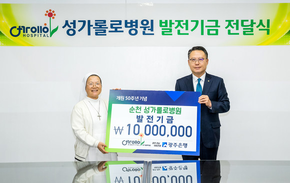 광주은행은 올해로 개원 50주년을 맞이한 성가롤로병원에 발전기금 1천만원을 전달하며 지역민의 건강한 삶을 위해 선도적인 병원으로 거듭나기를 기원하는 메시지를 전했다.