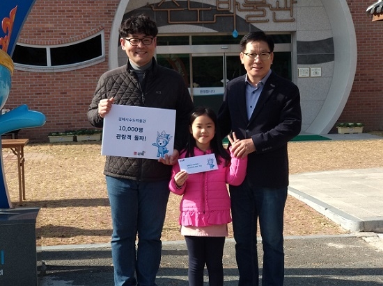 행운의 1만 번째 관람객은 김해시 삼계동에 사는 강명성씨와 부인, 자녀 가족 3명으로 수도박물관 측은 이 가족에게 선물을 전달하고 기념촬영을 했다.