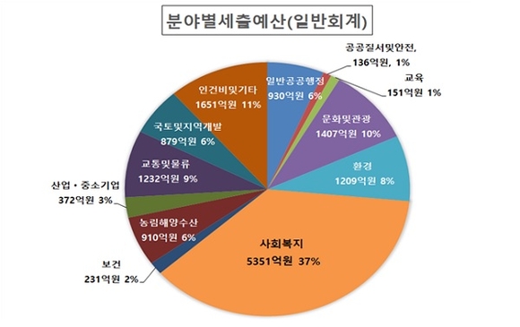 내년도 일반회계 세출예산을 분야별로 살펴보면 ▲사회복지․보건 5,582억원(39%) ▲문화 및 관광 1407억원 (10%) ▲수송 및 교통 1232억원(9%) ▲환경 보호 1209억원 (8%) ▲농림해양수산 910억원(6%) ▲일반공공행정 930억원(6%) ▲국토 및 지역개발 879억원 (6%) ▲산업 및 중소기업 372억원 (3%), ▲교육 150억원(1%) 공공질서 및 안전 136억원 (1%)이다.