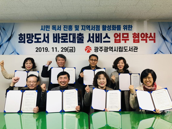 광주광역시립도서관은 지난 11월29일 ▲동구 광우서적 ▲서구 새날서점, 이호서점, 한림서적 ▲남구 글방문고 ▲북구 열린문고 ▲광산구 숨등 지역 7개 서점과 ‘희망도서 바로대출 서비스’ 업무협약을 체결했다.