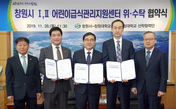 경남 창원시는 지난 28일 창원시Ⅰ, Ⅱ어린이급식관리지원센터 운영을 위해 창원대학교, 창원문성대학교 간 업무협약을 체결했다.