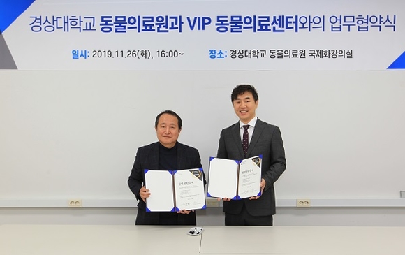 경상대학교 동물의료원은 지난 26일 수의과대학 국제화강의실에서 임상수의학의 발전 및 반려동물 의료의 질적 향상에 기여하기 위해 VIP 동물의료센터와 업무협약식을 가졌다.