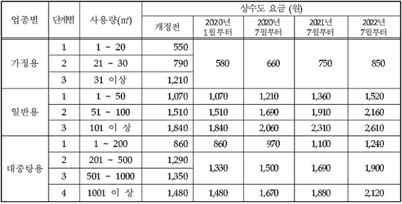 그리고 일반용과 대중탕용 수도요금은 영세업자의 경제적 부담을 고려해 누진제를 유지하되 내년 7월부터 3년간 상기 '업종별 요율표'와 같이 인상된다.