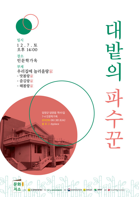 오는 12월 7일(토) 인문학가옥에서 오후 2시부터 진행되는 ‘대밭의 파수꾼’은 부제 ‘우리집에 놀러올랑가(家)’로 크게 총 3개의 프로그램인 ‘맛볼랑家’, ‘즐길랑家’, ‘해볼랑家’로 진행된다.