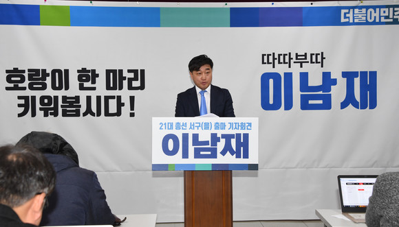 이남재 더불어민주당 전략기획위원회 부위원장은 9일 광주광역시의회 브리핑룸에서 “광주를 깨우는 야무진 호랑이. 광주정치, 호랑이 한마리 키워봅시다”라는 슬로건을 걸고 광주 서구을 지역 출마를 공식 선언했다.