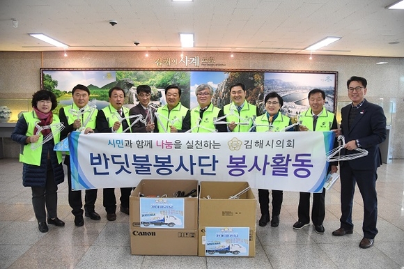 김해시의회 반딧불 봉사단은 지난 6일 시의회 의원 및 직원들이 수집한 옷걸이 1000여개를 노동자 작업복 공동세탁소에 전달했다.