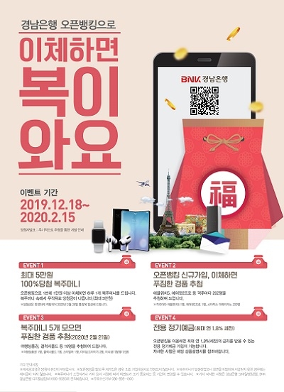 BNK경남은행이 오픈뱅킹(Open Banking) 서비스 본격 시행을 기념해 오는 18일부터 내년 2월 15일까지 '오픈뱅킹 서비스 대고객 이벤트'를 진행한다.