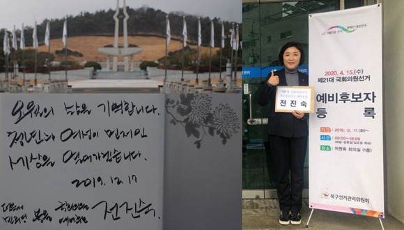 전진숙 예비후보는 예비후보 등록 전에 국립5.18민주묘지를 참배하고 방명록에 “5월의 삶을 기억합니다. 청년과 여성이 먼저인 세상을 열어가겠습니다.”라는 마음의 다짐을 하고, “2020년 21대 총선에서 민주당의 총선승리와 문재인 정부의 성공을 위해 야무진 전진숙이 앞장서 나가겠다.”고 밝혔다.