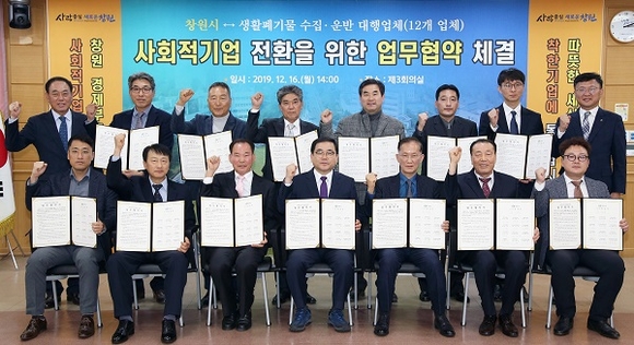 경남 창원시는 16일 시청 제3회의실에서 시 생활폐기물 수집·운반 대행업체 12개사와 사회적 기업 전환을 위한 협약을 체결했다.