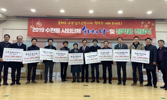 18일 광산구 수완동 기업·단체들이, 동 송년행사장에서 2020년 저소득층 고등학생과 대학 입학생에게 전달해 달라며 장학금 1210만원을 모아 동 지역사회보장협의체에 기탁했다. 장학금 모금에는 빛과 사랑교회, ㈜동양금속, W여성병원 등이 참여했다.