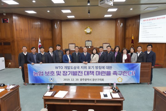 광산구의회는 정부가 지난 10월 25일 WTO 개발도상국 지위 포기 결정을 내리면서 쌀 및 곡물류, 쇠고기 등의 농축산물의 관세장벽이 대폭 완화되어돼 저소득과 고령화 및 농업인구 감소로 어려움을 겪고 있는 농민들의 고통이 가중된다는데 의원들의 뜻을 모았다.