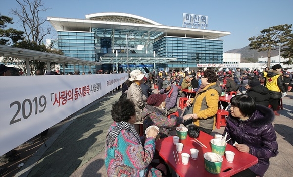 이어 마산역 광장을 찾은 지역민과 독거노인, 장애인, 무의탁자, 노숙자 등 소외계층 2000여명에게 동지팥죽을 무료로 대접했다.