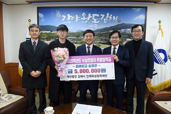 20일 허성곤 김해시장은 2020학년도 대입수능시험에서 만점을 받아 김해시인재육성장학재단 특별장학생으로 선발된 김해외고 3학년 송영준 학생에 대해 장학금 500만원을 전달했다.