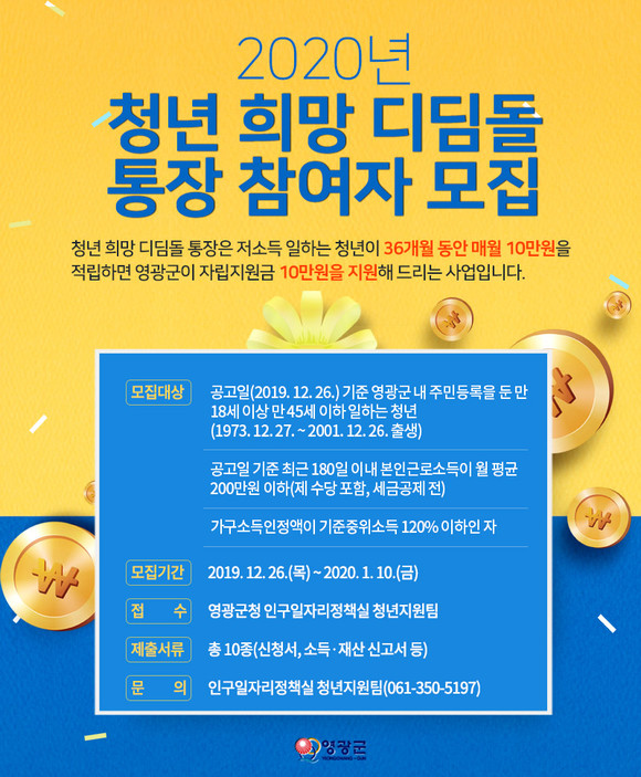 영광군(군수 김준성)은 ‘2020년 청년 희망 디딤돌 통장 사업’ 참여자를 26일부터 2020년 1월 10일까지(15일간) 모집한다고 밝혔다.