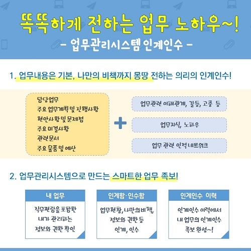 업무관리시스템을 활용한 전자적 인계인수는 그간 담당자의 PC에 있거나 서류철로 보관돼 전·후임자 간 제대로 공유되지 않은 정보나 알기 어려운 업무이력까지 누수 없이 인계인수하고 공유할 수 있다는 점에서 큰 의의가 있다.