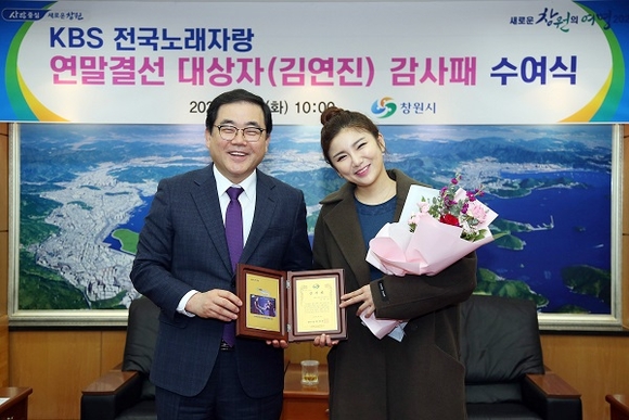 경남 창원시는 지난달 ‘2019 전국노래자랑 연말결선’에서 대상을 수상한 김연진(35·의창구) 씨에게 감사패를 전달했다고 7일 밝혔다.