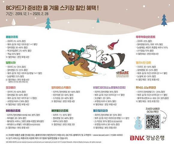 송영훈 카드사업부장은 “경남BC카드 가입 고객과 가족들이 전국 11대 스키장 할인 이벤트를 통해 겨울철 대표 레저 스포츠인 스키를 부담 없이 즐기기를 바란다. 앞으로도 고객들에게 알찬 혜택을 제공하기 위해 다양한 이벤트를 지속적으로 선보이겠다”고 말했다.