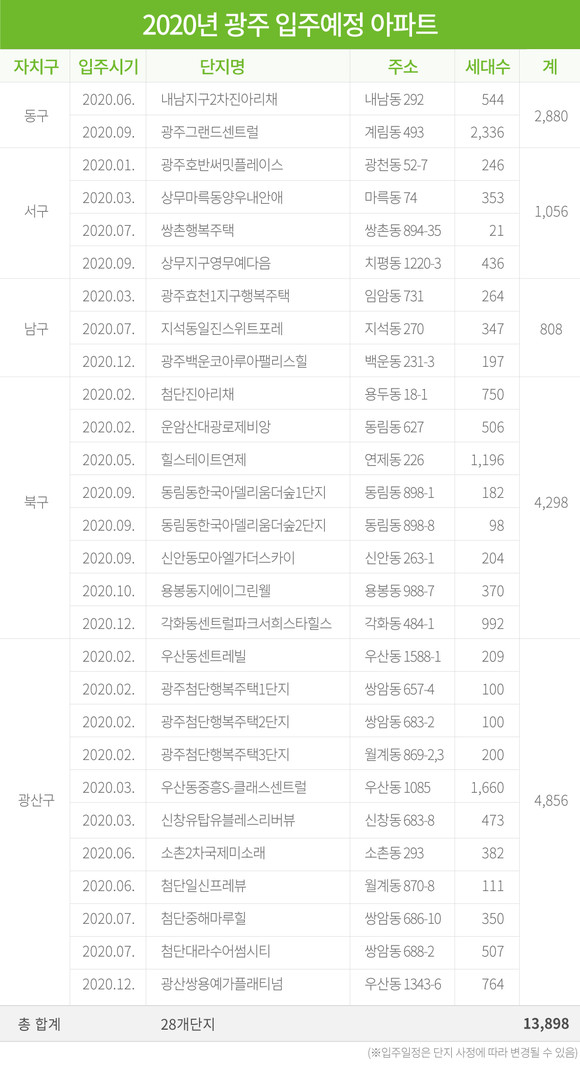 자치구 별로 보면 광산구가 4천856세대로 가장 많은 세대가 입주한다. 이어 북구(4천298세대), 동구(2천880세대), 서구(1천56세대), 남구(808세대) 순이다.