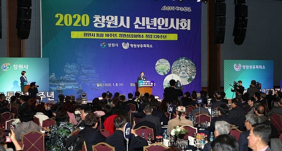 창원시와 창원상공회의소가 공동 주최한 '2020 창원시 신년인사회'가 8일 창원컨벤션센터(CECO)에서 허성무 창원시장, 한철수 창원상의 회장을 비롯한 지역 국회의원과 도·시의원, 기업인, 언론인 등 각급 기관단체장 500여명이 참석한 가운데 열렸다.