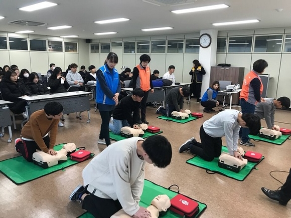 학생들은 2시간 동안 심폐소생술 이론과 실습, 기도폐쇄 하임리히법, 자동심장충격기 사용법 등을 배웠다.