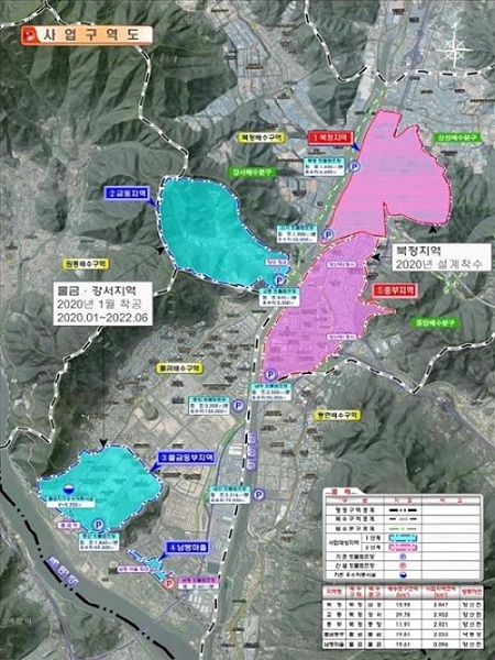 물금, 강서 지역은 `17년 환경부로부터 하수도정비 중점관리지역으로 선정돼 국비 143억원을 포함해 총 214억 여원의 사업비를 투입해 하수관로 7.6km를 정비하고, 빗물펌프장 1개소를 설치하는 사업으로, 올해 착공해 `22년 6월 사업을 완료할 계획이다.