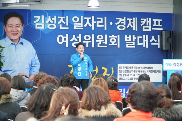 문재인 대통령후보 경제산업특보를 역임한 김성진 광주광산(을) 더불어민주당 국회의원 예비후보는 17일 선거사무실에서 지지자들과 함께 더불어민주당 당내 경선 승리를 위한 여성위원회·특보단 발대식을 개최했다.