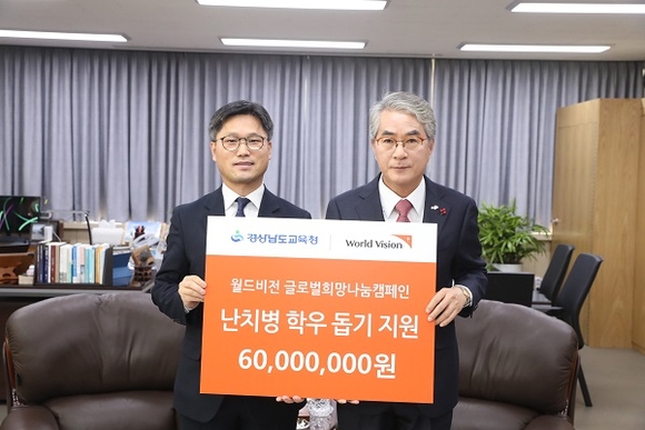 경남도교육청은 20일 월드비전 경남지역본부로부터 글로벌희망 나눔 캠페인 난치병 학우 돕기 성금 6천만원을 전달받았다고 밝혔다.