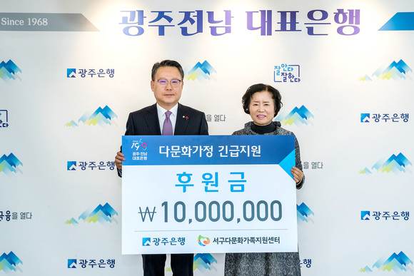 송종욱 광주은행장은 “병상에 있는 남편 대신 세 아이의 생계와 교육을 책임져야 하는 결혼이주여성의 안타까운 사연을 접하고, 평소 다문화가정 결혼이주여성들의 복지증진을 위해 힘써왔던 광주·전남 대표은행으로서 긴급히 도움을 주기로 했다. 앞으로도 지역의 소외된 곳곳에 온정을 전파할 수 있도록 은행의 이익을 지역사회와 함께 나누는 사회공헌활동에 적극 앞장서겠다”고 말했다.