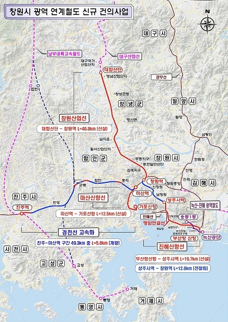창원산업선(신설 L=46.8km, 9290억원)은 작년 1월 예비타당성조사가 면제된 대구산업선의 연장노선으로 부산항 제2신항 및 마산가포신항을 연결하는 철도물류축을 형성하고, 여객수송을 병행해 대구-창원간 광역 이동수요를 처리할 것으로 전망된다.